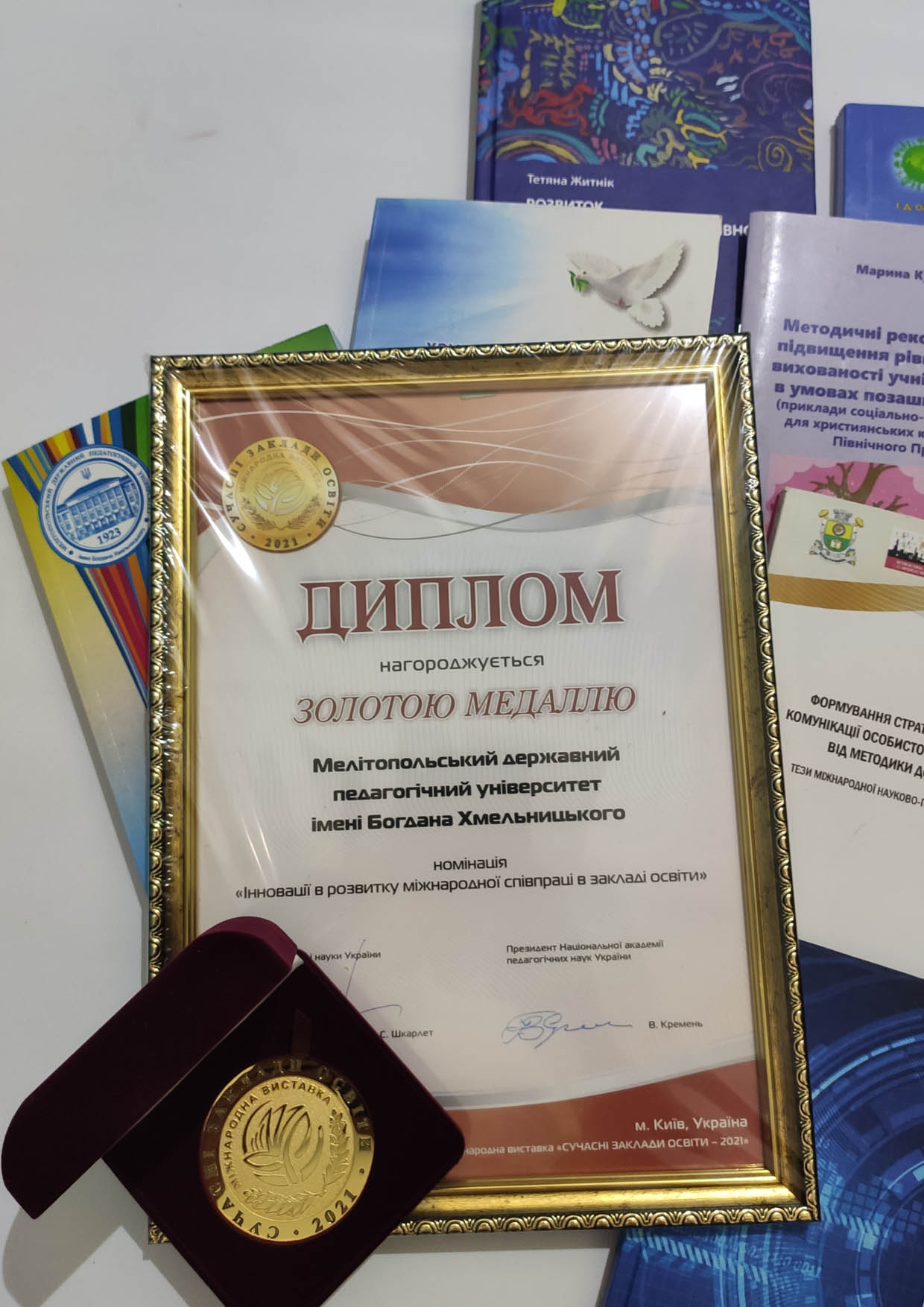 Ця почесна нагорода, отримана колективом університету, є значущою для кожного науково-педагогічного працівника, адже саме вони кожний день розширюють та змінюють можливості для творення нового знання. Оцінювання здобутків університету відбувалося і у тематичних конкурсах із різних номінацій. У цьому році комісія гідно оцінила роботу на тему: «Інноваційна практика в інтегруванні до європейського освітньо-наукового простору (досвід Центру болгаристики Мелітопольського державного педагогічного університету імені Богдана Хмельницького)» з номінації «Інновації в розвитку міжнародної співпраці в закладі освіти». Авторський колектив (кандидат історичних наук, доцент Пачев Сергій Іванович, кандидат філологічних наук, доцент Пачева Валентина Миколаївна, доктор Колева Красимира Дочева) отримав золоту медаль в номінації «Інновації в розвитку міжнародної співпраці в закладі освіти».