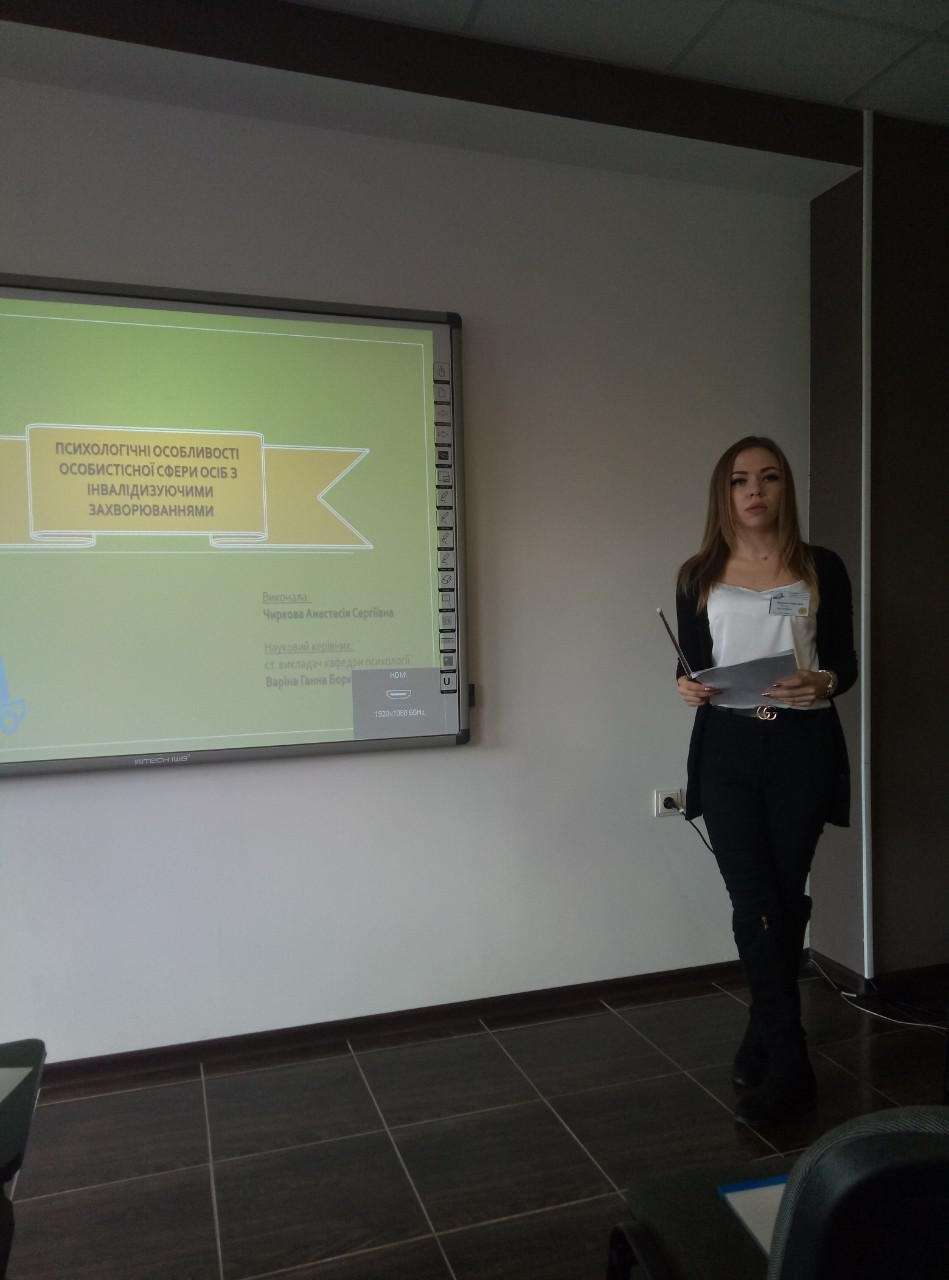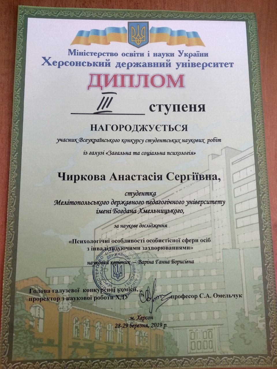 28-29 березня 2019 року на базі Херсонського державного університету відбувся ІІ тур Всеукраїнського конкурсу студентських наукових робіт з природничих технічних та гуманітарних наук із галузі знань «Загальна та соціальна психологія». Студентка ІІІ курсу Мелітопольського державного педагогічного університету імені Богдана Хмельницького, спеціальність «Психологія», Чиркова Анастасія Сергіївна на підсумковій науково-практичній конференції захищала наукову роботу на тему «Психологічні особливості особистісної сфери осіб з інвалідизуючими захворюваннями», науковий керівник – ст.викл.кафедри психології, Варіна Ганна Борисівна. Наукова робота виконана в рамках проекту наукової роботи, науково-технічної (експериментальної) розробки молодих учених, що виконується за рахунок коштів загального фонду державного бюджету «Розробка методології психолого-педагогічного супроводу сімей, які виховують дітей з особливими потребами». Наукова робота Чиркової А. С. є результатом багаторічної дослідницької діяльності в рамках активної участі у діяльності студентського наукового гуртка кафедри психології «ORDO AMORIS». За результатами захисту наукової роботи Чиркова Анастасія Сергіївна отримала диплом ІІІ ступеня.