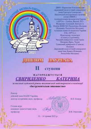 Диплом лауреата ІІ ступеня – студентка Навчально-наукового інституту соціально-педагогічної та мистецької освіти Свириденко Катерина, керівник – старший викладач кафедри інструментального виконавства та музичного мистецтва естради Елеонора Власенко.