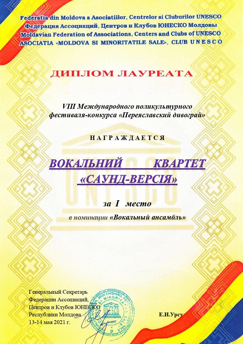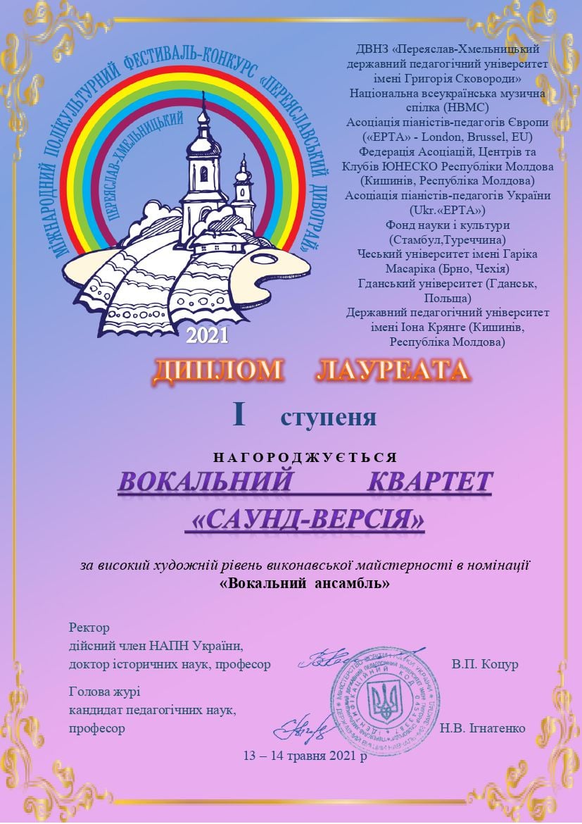 Диплом лауреата І ступеня – вокальний квартет «Саунд-версія», керівник – доцент кафедри інструментального виконавства та музичного мистецтва естради Олександр Стотика.