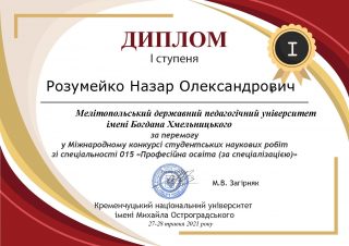 Здобувач ІІ курсу першого (бакалаврського) рівня спеціальності 015.10 Професійна освіта (Комп’ютерні технології) Розумейко Назар представив на захист наукову роботу на тему «Використання Class Time у підготовці педагогів професійного навчання» і нагороджений дипломом І ступеня!