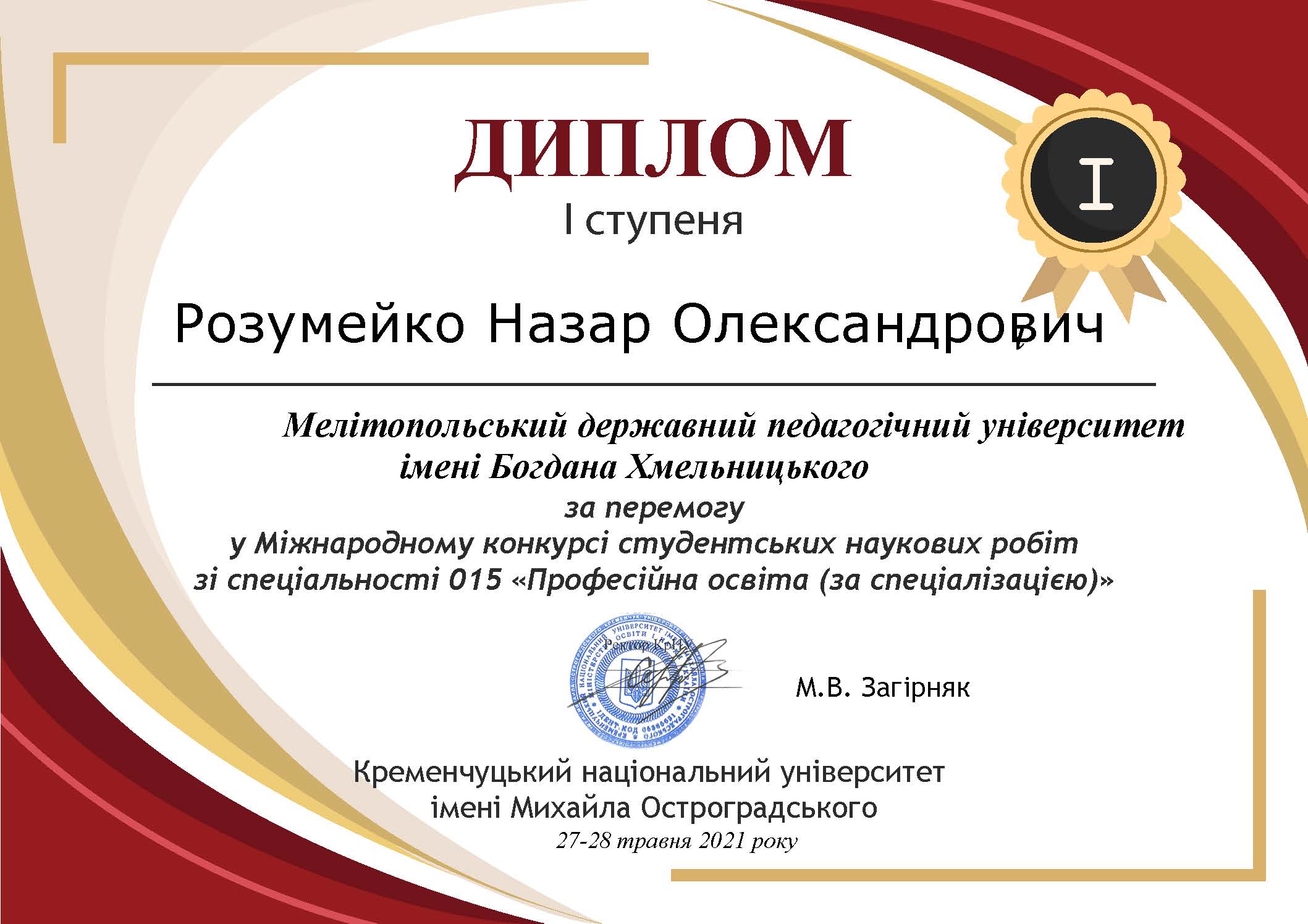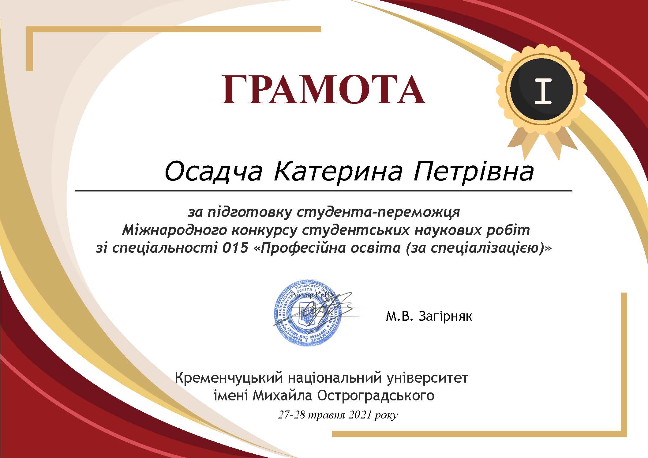 27-28-го травня 2021 року на базі Кременчуцького національного університету імені Михайла Остроградського відбувся Міжнародний конкурс студентських наукових робіт зі спеціальності 015 «Професійна освіта (за спеціалізацією)».