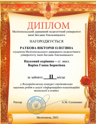 Вітаємо талановиту студентку з отриманням визнання на Всеукраїнському конкурсі та бажаємо нових перемог, подальших успіхів у навчанні і розпочатій науково-дослідній роботі.