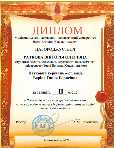 На підставі рецензій та оцінки наукових доповідей учасників науково-практичної конференції від галузевої конкурсної комісії роботі було присуджено призове ІІ місце!