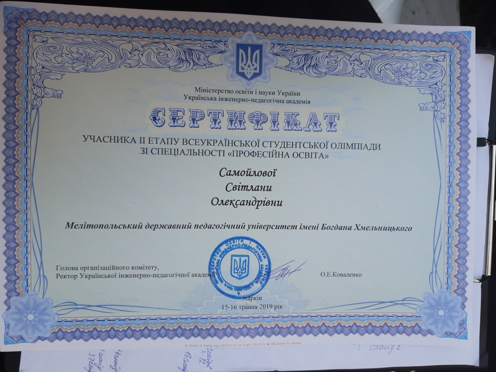 Вітаємо з І-м місцем у Всеукраїнській студентській олімпіаді зі спеціальності «Професійна освіта»!15-16 травня 2019 року в Українській інженерно-педагогічній академії відбувся ІІ етап Всеукраїнської студентської олімпіади зі спеціальності «Професійна освіта».