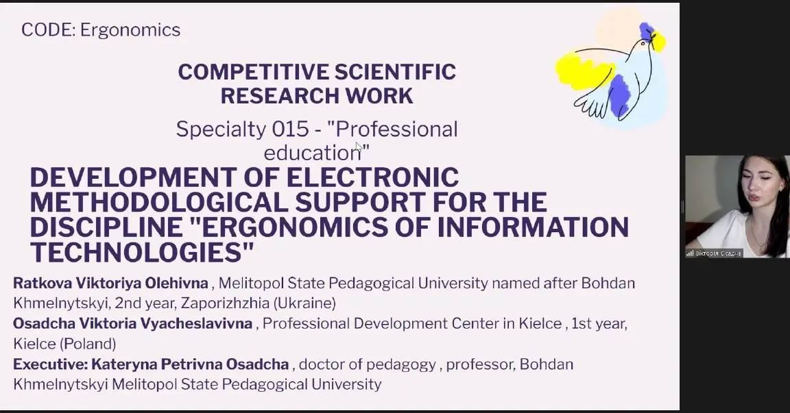 Колектив Мелітопольського державного педагогічного університету імені Богдана Хмельницького вітає учасниць від кафедри інформатики і кібернетики з отриманням І-го місця — магістрантку Ранкову Вікторію, її співавторку – студентку польського коледжу Осадчу Вікторію та їх керівника проф. Осадчу К.П.