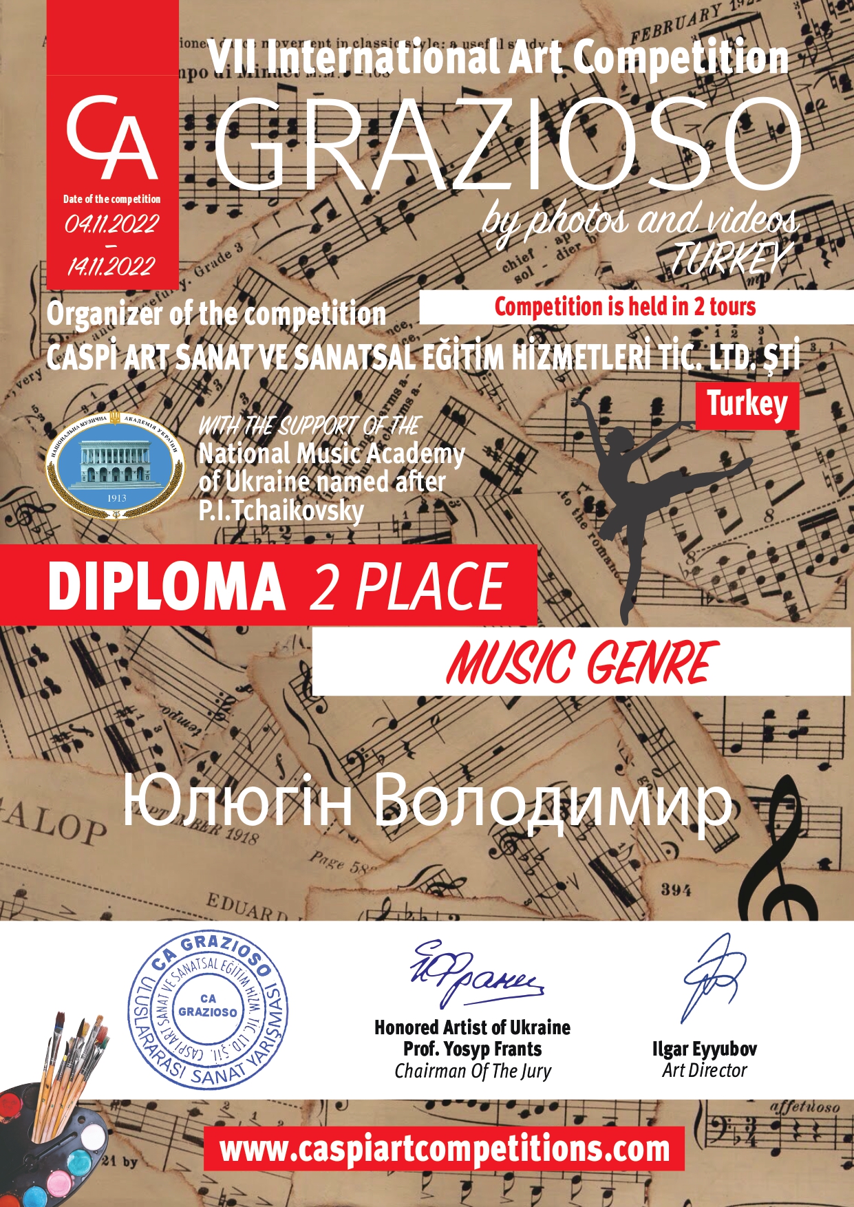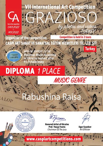 04-14.11.2022 р. віддзвенів VII Міжнародний онлайн-конкурс мистецтв “GRAZIOSO”. Конкурс відбувся при підтримці та сприянні Національної музичної академії П. І. Чайковського. Організатор конкурсу – Caspi Art Sanat Ve Sanatsal (Туреччина).