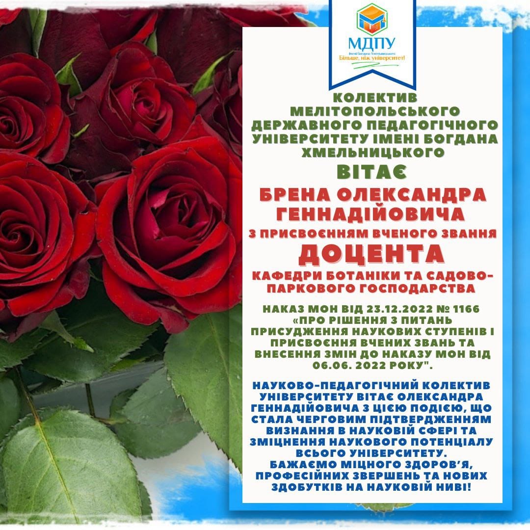 Брена Олександра Геннадійовича – присвоєно вчене звання доцента кафедри ботаніки та садово-паркового господарства.
