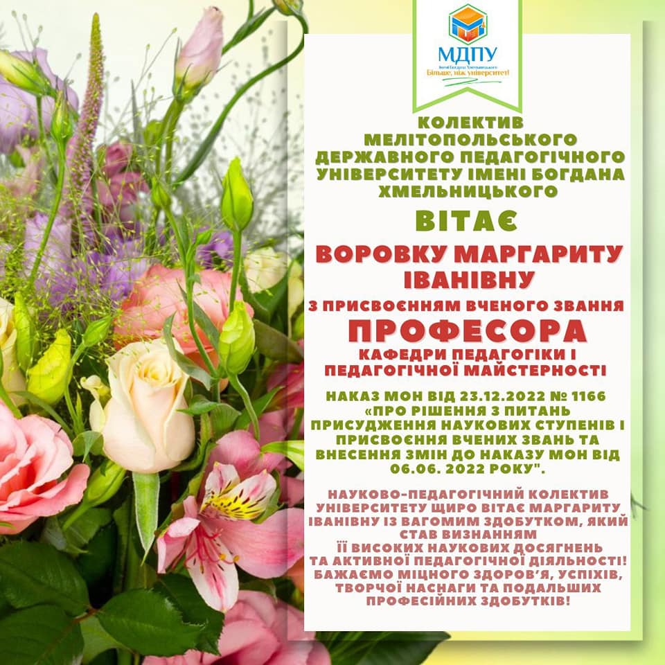 Колектив Мелітопольського державного педагогічного університету імені Богдана Хмельницького, згідно Наказу МОН України від 23 грудня 2022 року “Про рішення з питань присудження наукових ступенів і присвоєння вчених звань та внесення змін до наказу МОН від 6 червня 2022 року”, вітає з присвоєнням вчених звань:
