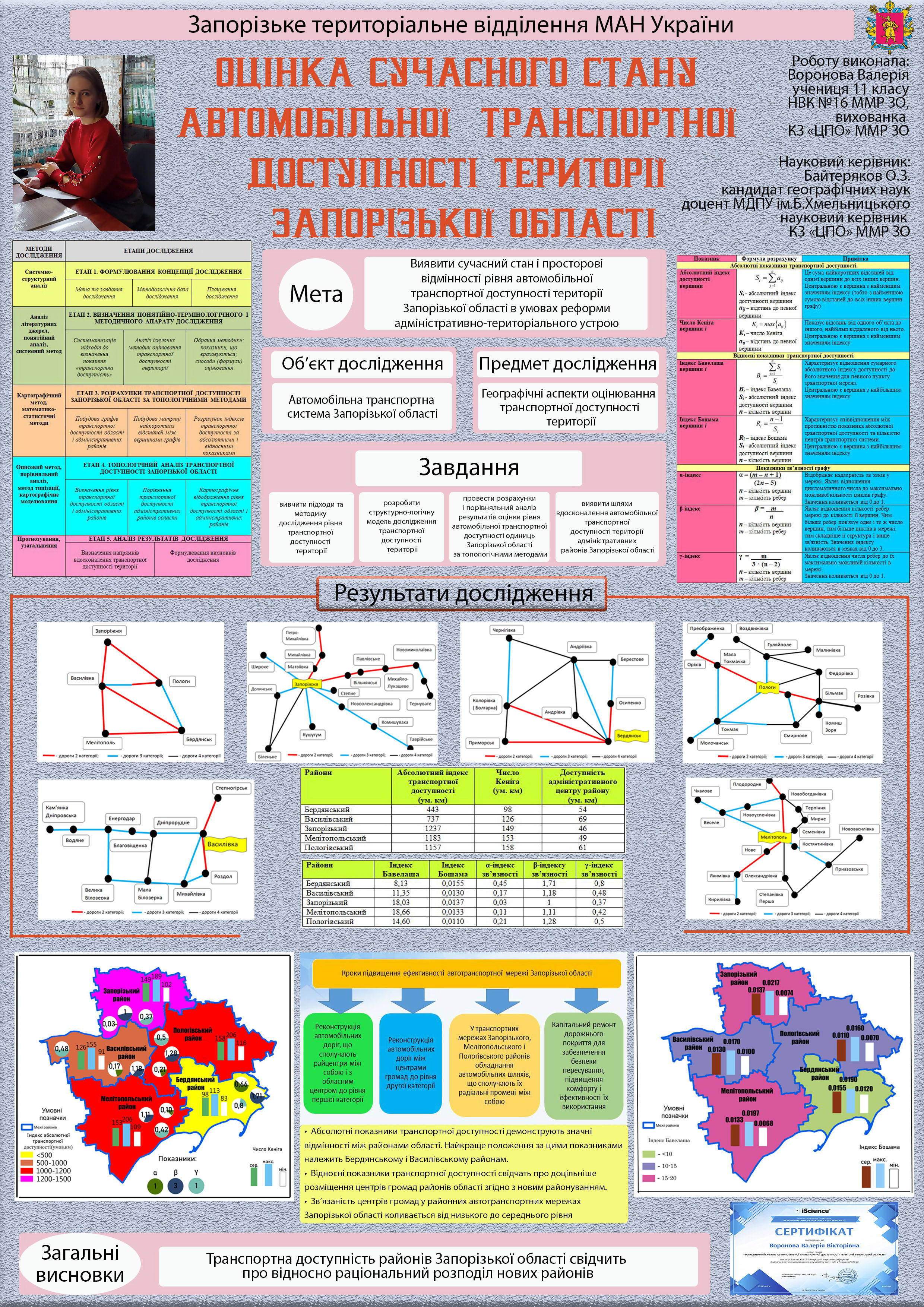 Її дослідження на тему «Оцінка сучасного стану автомобільної транспортної доступності території Запорізької області» відрізнялось актуальністю і високим науковим рівнем.