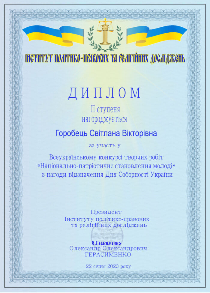 🇺🇦👩🏼🎓здобувачку Горобець Світлану Вікторівну 311/2-aгрупи І рівня вищої освіти факультету фізичної культури, спорту та психології та керівника доцента кафедри психології Остополець Ірину Юріївну із здобуттям диплому ІІ ступеня;