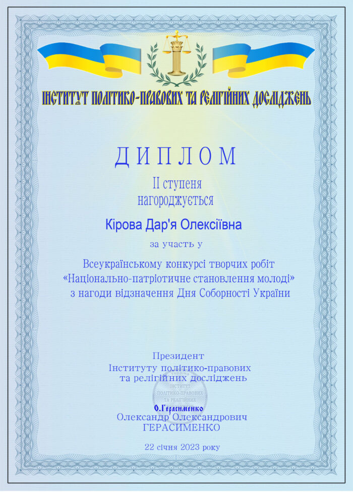 🇺🇦👩🏼🎓здобувачку Кірову Дарʼю Олексіївну 412-сп групи І рівня вищої освіти факультету соціально-педагогічної та мистецької освіти спеціальності 231 Соціальна робота зі здобуттям диплому ІІ ступеня;