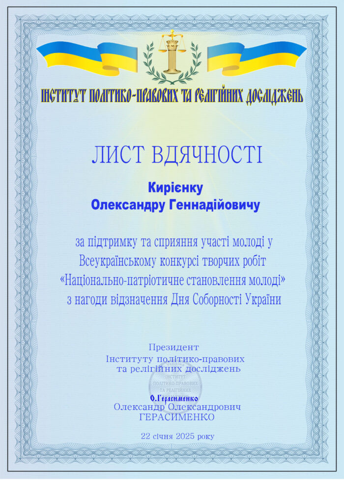 📝‼️ Всеукраїнський конкурс був проведений Інститутом політико-правових та релігійних досліджень за підтримки Міністерства молоді та спорту України, Національного агентства із забезпечення якості вищої освіти, Національної академії педагогічних наук України, Європейської культурної асамблеї, Київської міської державної адміністрації, Всеукраїнського товариства «Знання» України та ін.