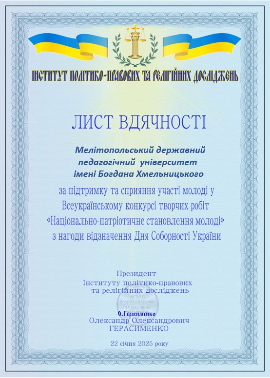 🇺🇦‼️Листом вдячності відмічений Мелітопольський державний педагогічний університет імені Богдана Хмельницького за підтримку та сприяння участі молоді у Всеукраїнського Конкурсі творчих робіт.