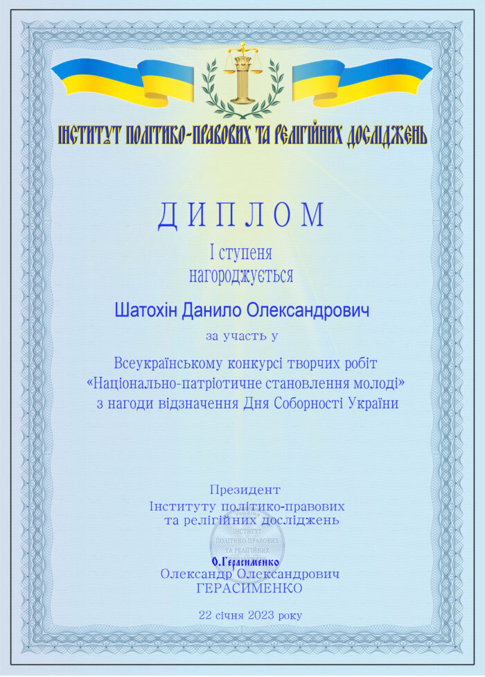 🇺🇦👨🏼🎓здобувача Шатохіна Данила Олександровича 214-ф групи І рівня вищої освіти факультету фізичної культури, спорту та психології та керівника старшого викладача кафедри теорії та методики фізичного виховання Кирієнка Олександра Геннадійовича із здобуттям диплому І ступеня;