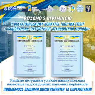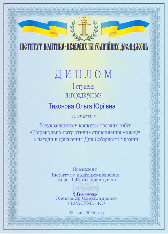 🇺🇦👩🏼🎓здобувачку Тихонову Ольгу Юріївну М 714-сп групи ІІ рівня вищої освіти факультету соціально-педагогічної та мистецької освіти та керівницю доцента кафедри освітології та педагогіки мистецтва Кожевникову Алла Власівну із здобуттям диплому І ступеня;