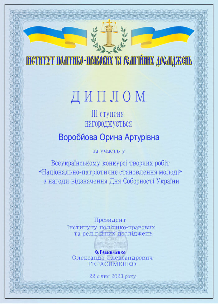 🇺🇦👩🏼🎓 здобувачку Воробйову Орина Артурівну 414-сп групи І рівня вищої освіти факультету соціально-педагогічної та мистецької освіти спеціальності 231 Соціальна робота зі здобуттям диплому ІІІ ступеня.