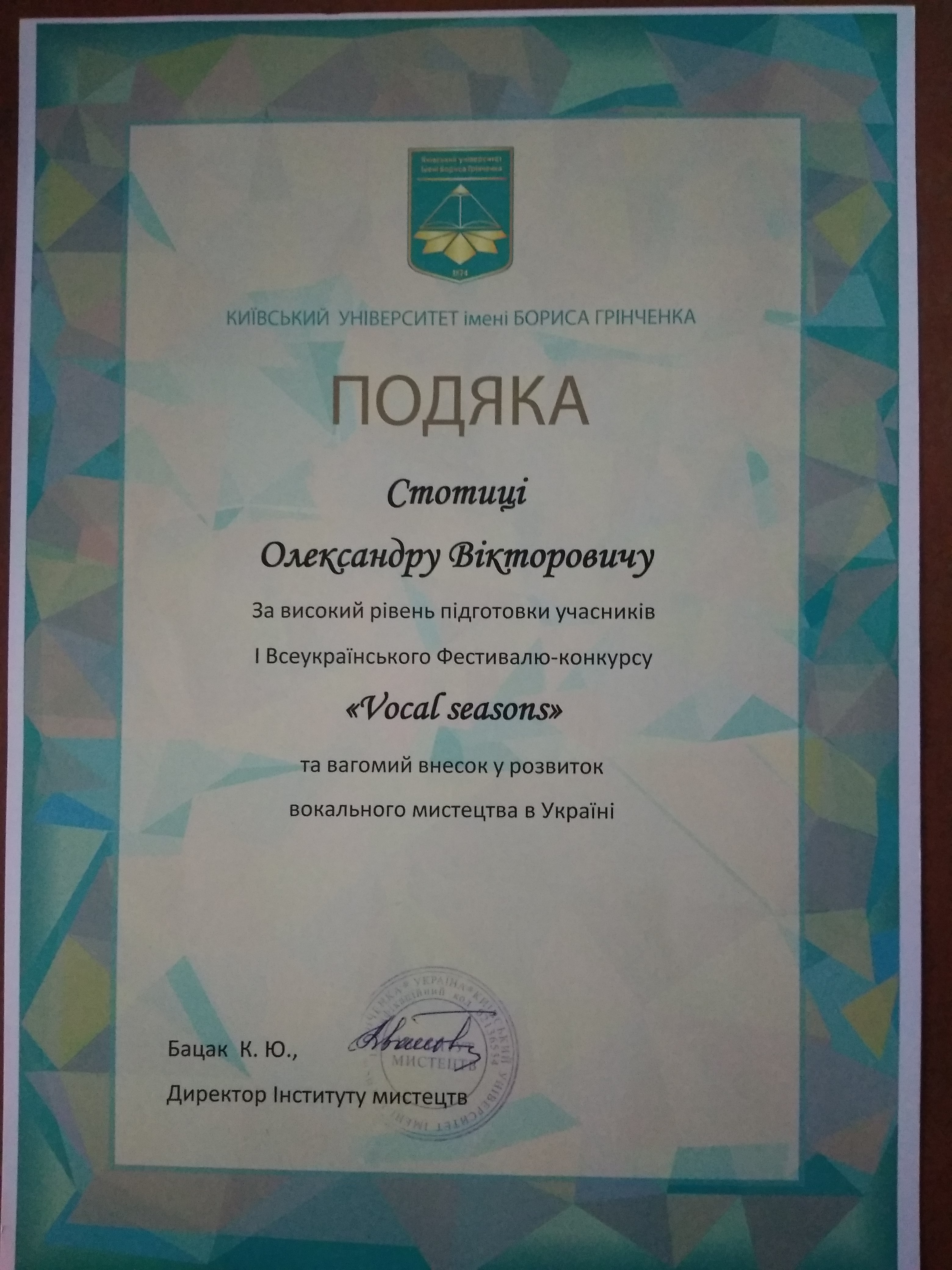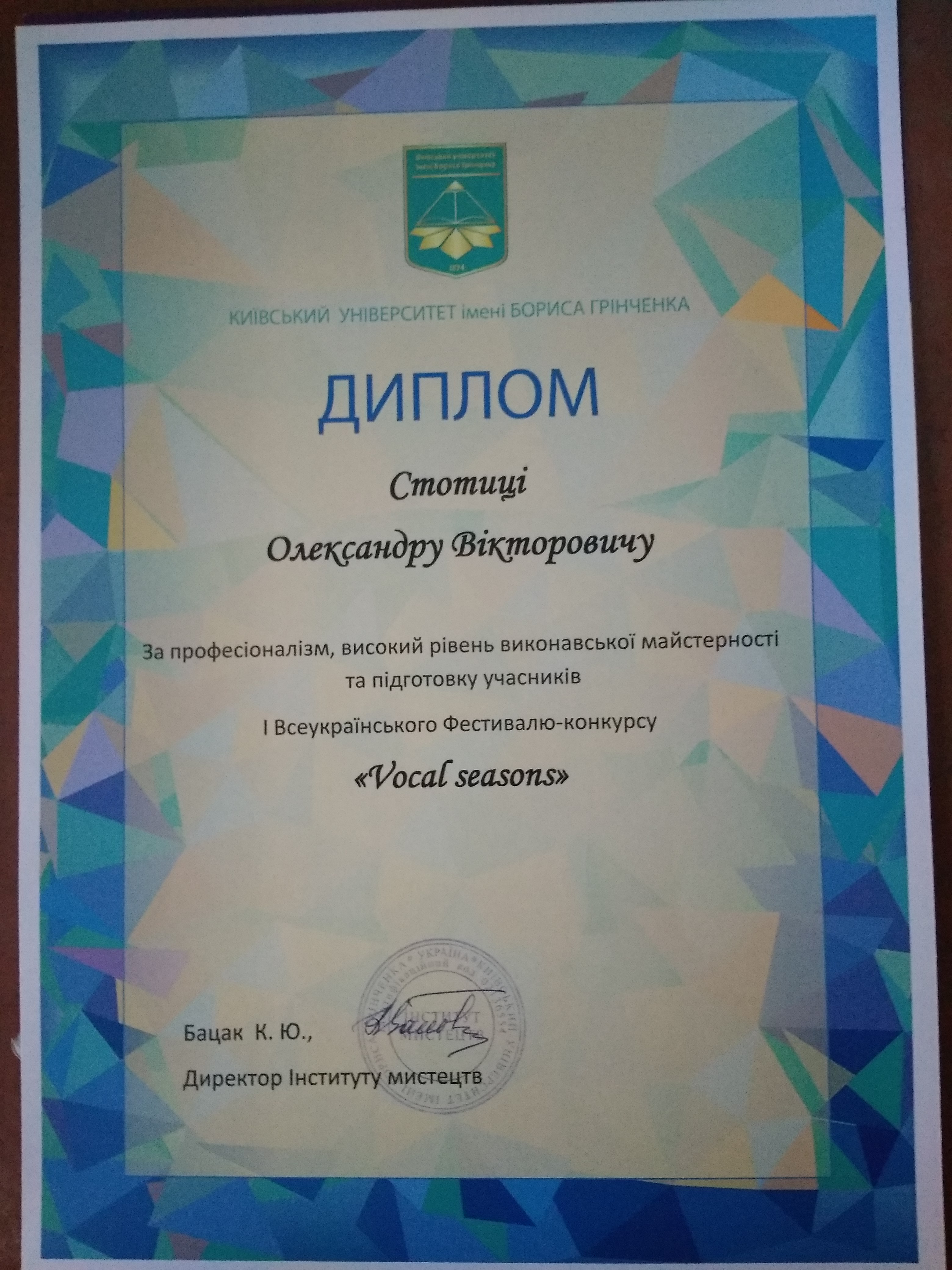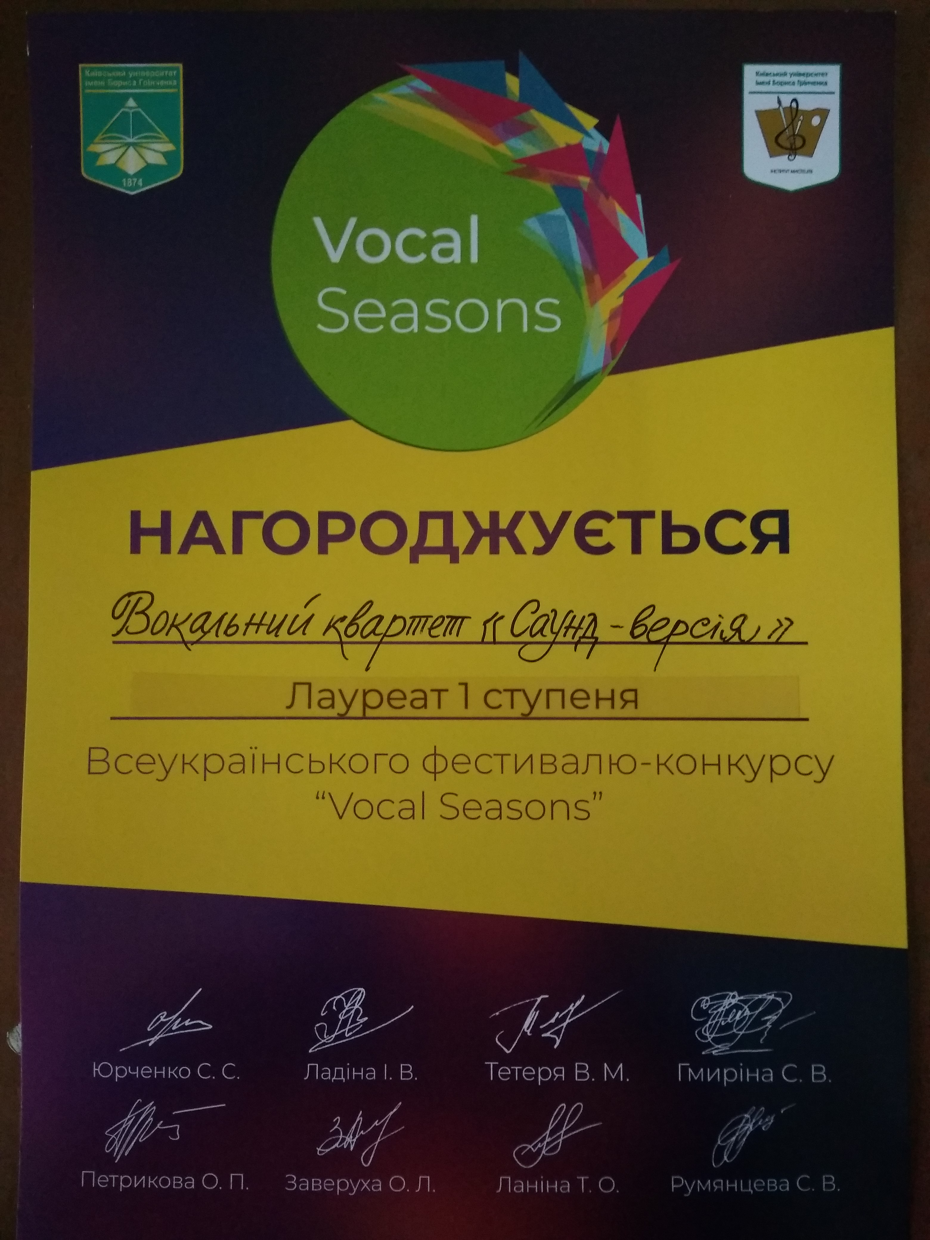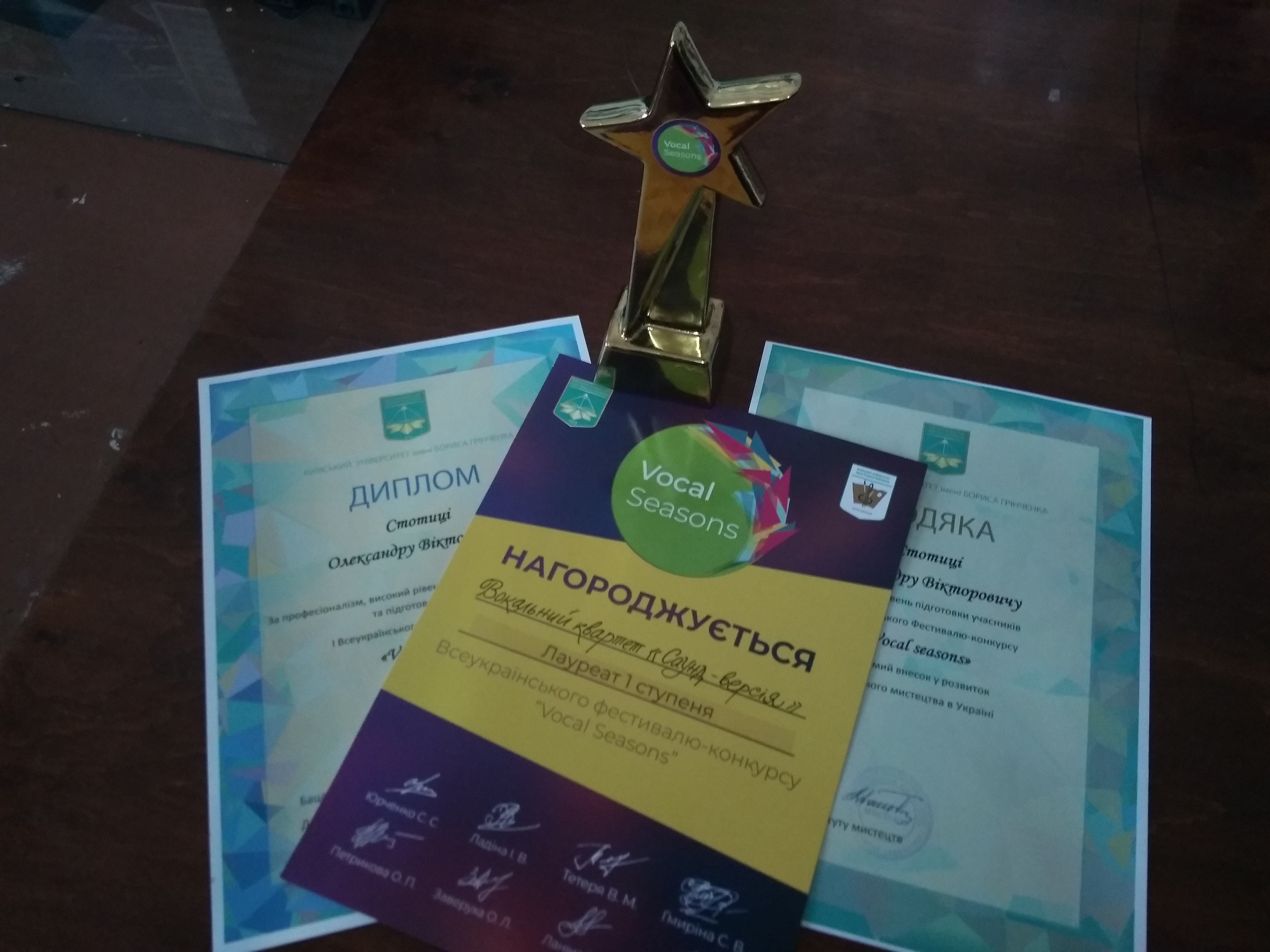 Щиро вітаємо Авакімову Анастасію, Бас Юлію, Новікову Ольгу, Турко Надію і керівника колективу Стотику Олександра Вікторовича, адже це дійсно заслужена перемога! Бажаємо не зупинятися на досягнутому! Нових яскравих виступів і творчих перемог!