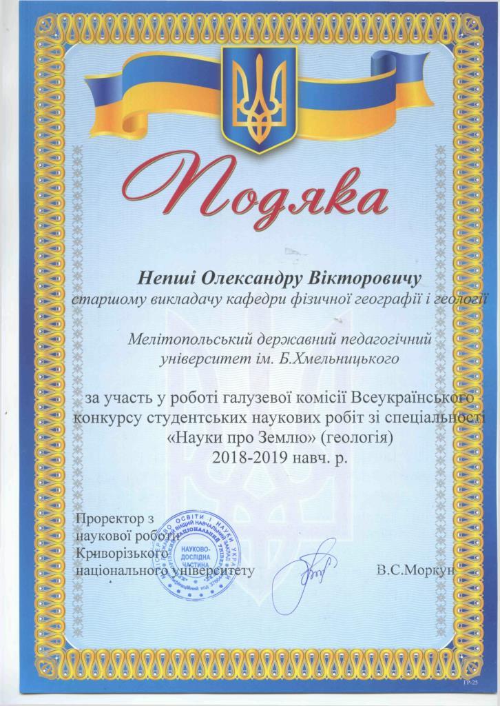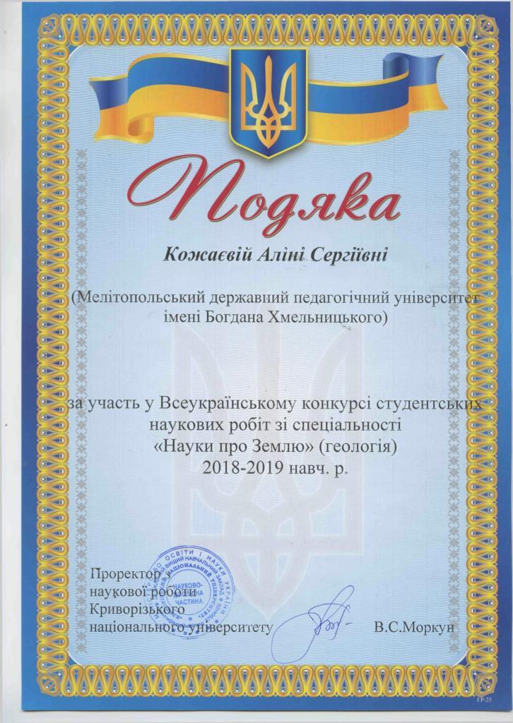 За результатами попереднього відбору наукових робіт на конкурс була запрошена студентка 116-п групи природничо-географічного факультету спеціальності 014.07 Середня освіта (Географія) Кожаєва Аліна. Вона представила наукову роботу за темою «Сучасна динаміка схилів північного узбережжя Азовського моря (на прикладі Ботієвської ділянки)» (науковий керівник: старший викладач кафедри фізичної географії і геології Непша О.В.).