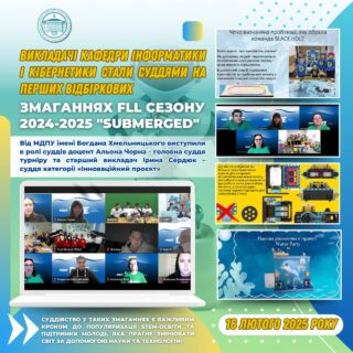 📅✅ 16 лютого 2025 року викладачі кафедри інформатики і кібернетики взяли активну участь у перших відбіркових змаганнях FIRST LEGO League (FLL) сезону 2024-2025, виступаючи в ролі суддів:
