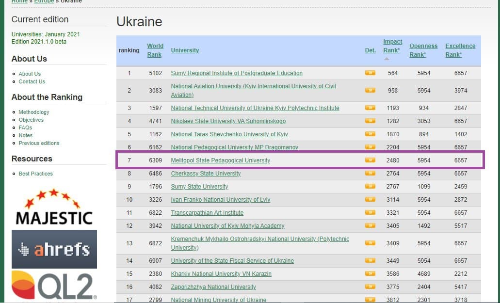 Згідно з ним, Мелітопольський державний педагогічний університет імені Богдана Хмельницького, покращив попередній рейтинг на 6 позицій (з 68 на 62 місце), посівши високе 2 місце серед педагогічних закладів вищої освіти України. Університет продовжує демонструвати високий рівень діяльності та присутності в інтернет-просторі, а також забезпечує максимальну доступність інформації для усіх користувачів мережі Інтернет, посівши 7 місце (у попередній версії рейтингу МДПУ імені Богдана Хмельницького посідав 13 місце) за показником “Impact Rank” (зовнішні посилання на сайт університету) серед 320 закладів вищої освіти.