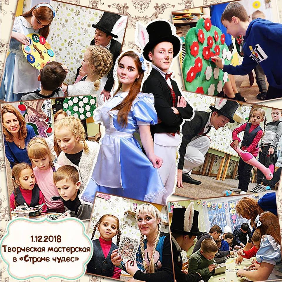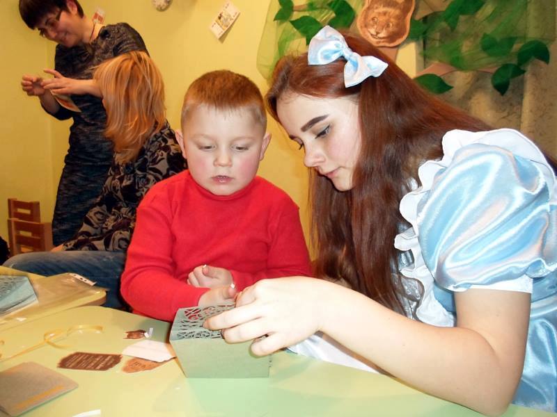 А атмосфера, без перебільшення, була казкова. Діти і батьки познайомилися з казковими героями Алісою і Білим Кроликом. Переглянули чарівну книгу про Алісу з «живими» об’ємними сторінками з особистої колекції об’ємних книг Олександра і Анни Брянцевих. Пригадали цю казку у емоційній і яскравій розповіді Анни Брянцевої. Зробили на добру згадку про Країну Див, у якій вони побували, об’ємну листівку з героями Казки з купою таємниць – буде що показувати вдома. А допомагали дітям і їх батькам створити непересічну листівку, як завжди, Олександр і Анна Брянцеви, щоправда цього разу їм активно допомагали Аліса і Білий Кролик.