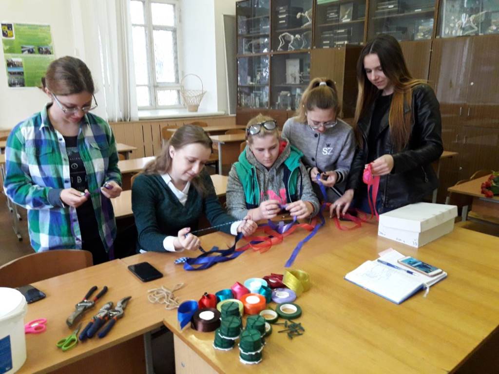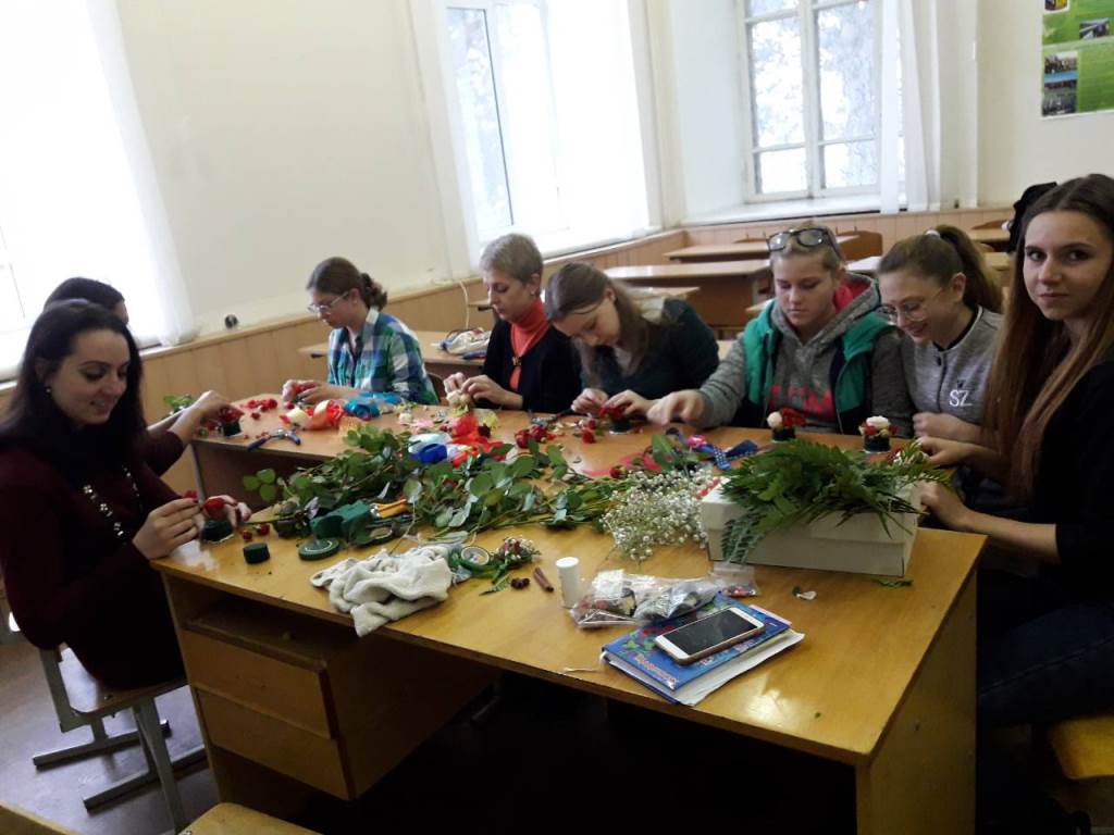 Дівчата під керівництвом асистента кафедри екологічної безпеки та раціонального природокористування Коваленко Д.В. власноруч з живих квітів виготовили бутоньєрку.