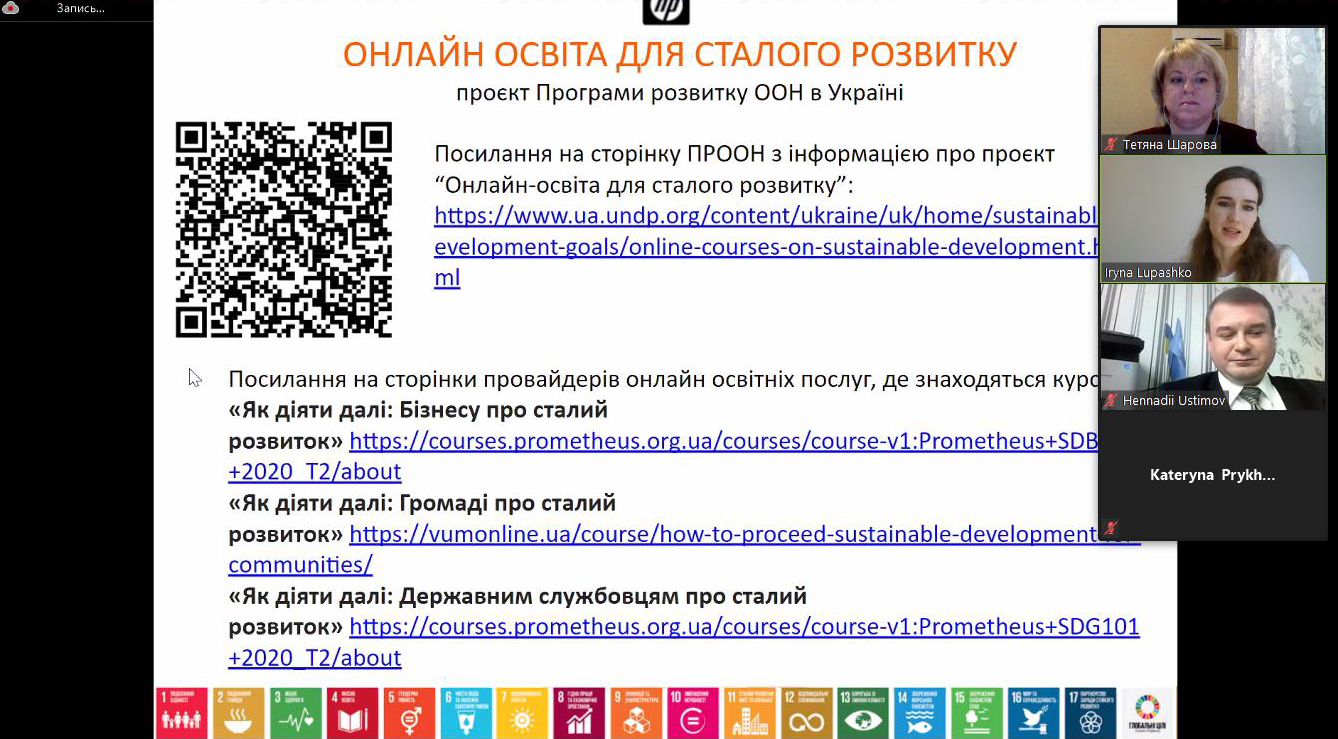 Під час заходу було представлено 4 доповіді від представників бізнесу, влади та громади Запорізької області. З вітальним словом до представників Запорізької області, учасників онлайн-заходу з цілей сталого розвитку звернулася Катерина Приходько, менеджерка проекту «Онлайн освіта для сталого розвитку» (м.Київ).