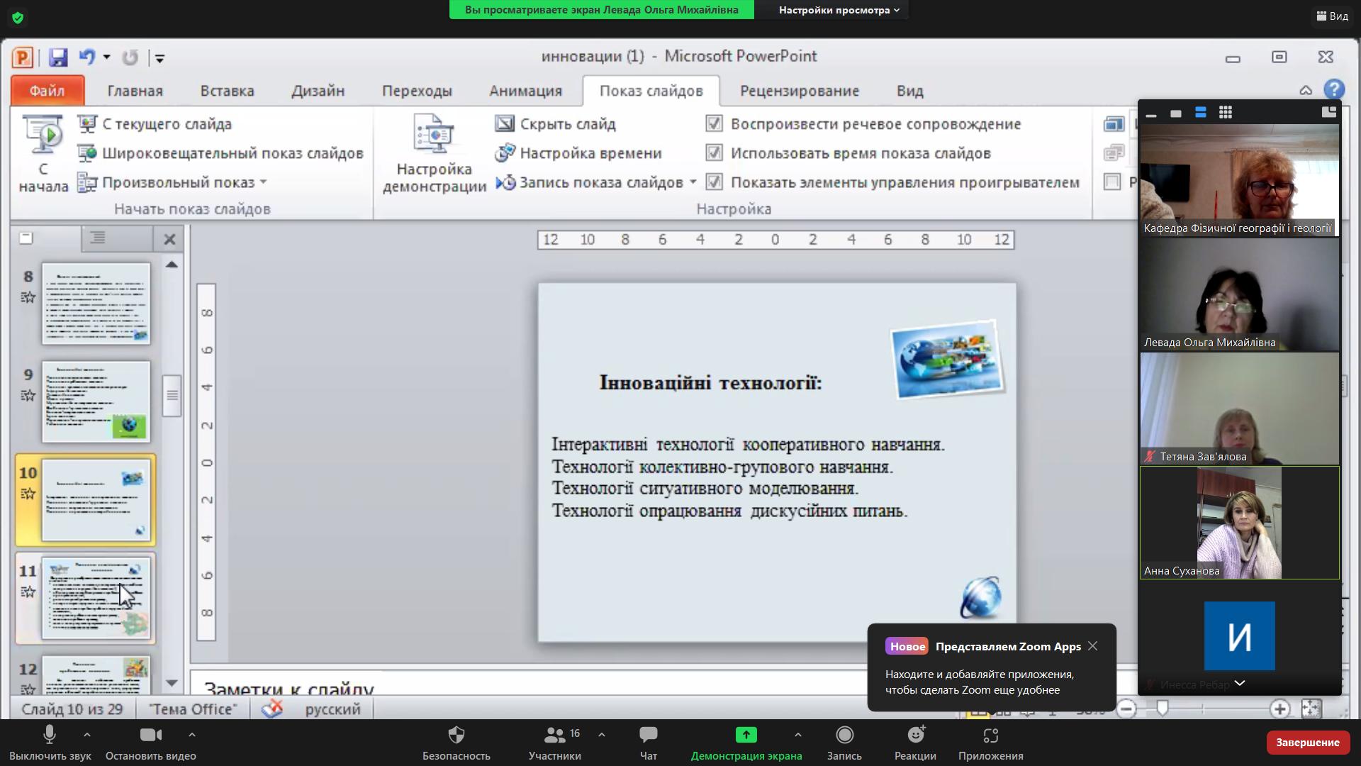 На заході були присутні члени кафедри: доценти Гришко С.В. і Прохорова Л.А., старші викладачі Непша О.В. і Зав’ялова Т.В., науково-педагогічні працівники кафедр університету. Доповідачі: доцент Левада О.М. і старший викладач Іванова В.М. наголосили на важливості впровадження інноваційних технологій у сучасній вищій школі, зупинилися на головних рисах освітніх інновацій, їх класифікації, перевагах та застосуванні інноваційних технологій під час викладання географії.