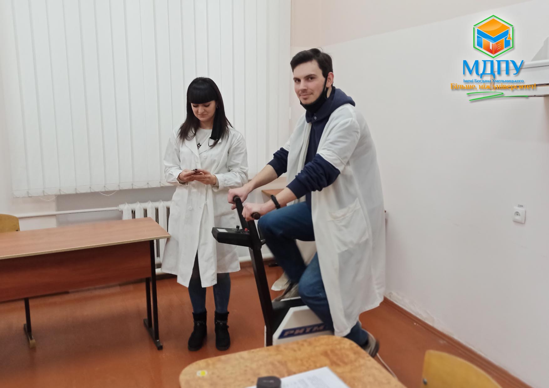 Так, доцент Сидоряк Н.Г. робила дослідження стану серцево-судинної системи за допомогою велоргометра. У студентів на початку заняття підрахували частоту серцевих скорочень та виміряли артеріальний тиск у стані спокою. Потім студенти працювали на велоргометрі протягом 4 хвилин. Після закінчення виконання фізичного навантаження одразу підраховували тиск та пульс. Досліджуваний студент відпочиває 3 хвилини та знову виконує фізичне навантаження. Після 4 хвилин на велоргометрі знову підраховують тиск та пульс.