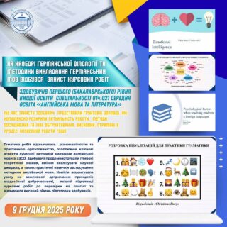 📖✅ Тематика робіт відзначалась різноманітністю та практичною орієнтованістю, охоплюючи ключові аспекти сучасної методики навчання англійської мови в ЗЗСО, а саме: «Візуалізація навчального матеріалу на уроках англійської мови», «Використання ІКТ у навчанні англійської мови в школі на прикладі теми “Країна, мова якої вивчається” у 9 класі», «Psychological factors when teaching students a foreign language» тощо.
