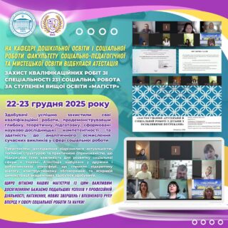 відбулася атестація за ступенем вищої освіти «Магістр» здобувачів груп М414-сп та ср 24М денної та заочної форм навчання — захист кваліфікаційних робіт зі спеціальності 231 Соціальна робота (ОПП Соціальна робота. Арт-терапія в соціальній сфері).
