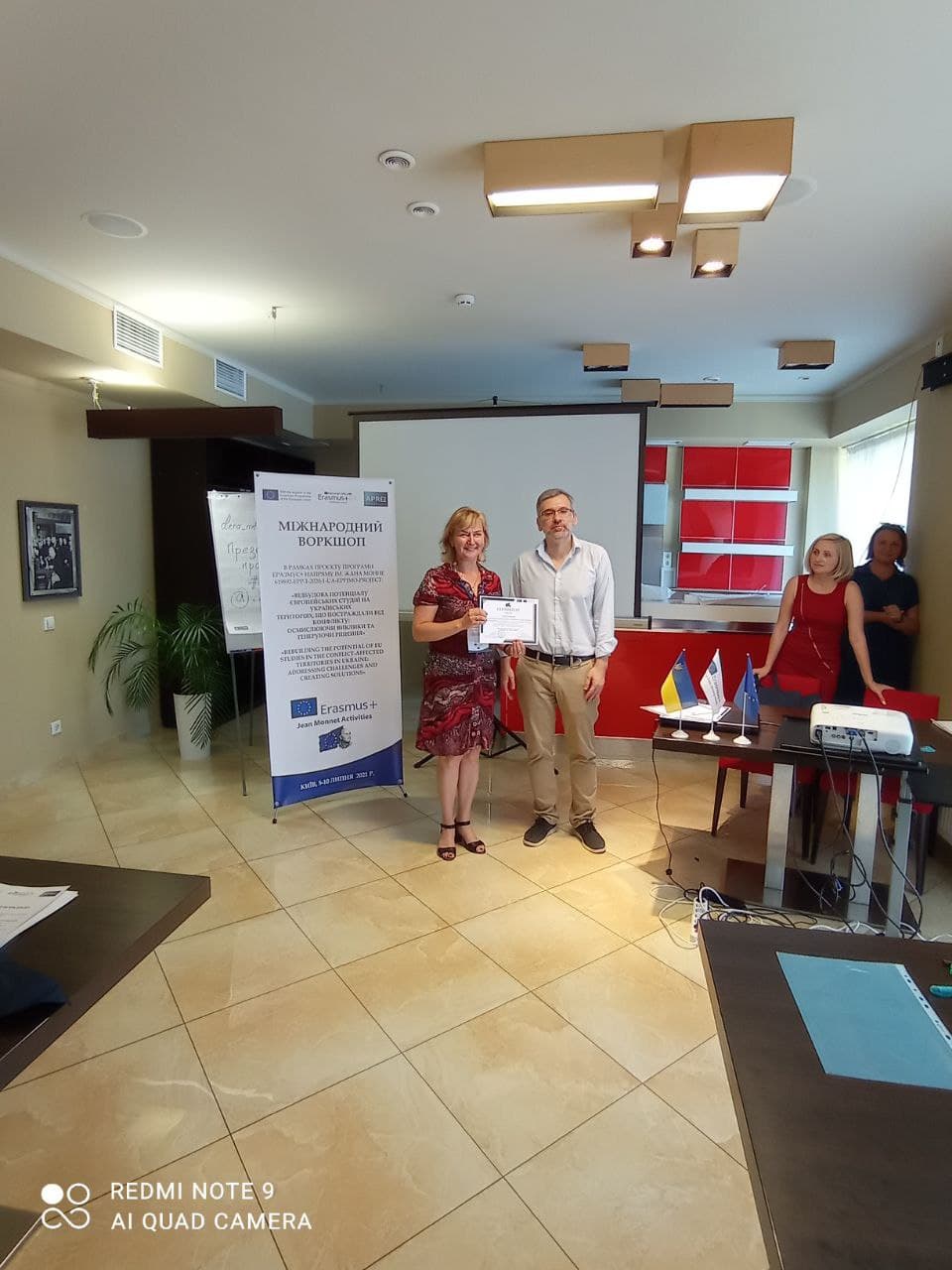 Для декана філологічного факультету, доцента Тетяни Коноваленко та завідувача кафедри української і зарубіжної літератури, доцента Надії Акулової початок липня став продуктивним, адже упродовж тижня (05.07.21-10.07.21) вони разом із колегами з 8 інших українських університетів долучились до Міжнародного воркшопу за програмою Erasmus+ напряму імені Жана Моне “Rebuilding the Potential of EU Studies in the Conflict-affected Areas of Ukraine: Addressing Challenges and Creating Solutions” (Відбудова потенціалу європейських студій на українських територіях, що постраждали від конфлікту: осмислюючи виклики та генеруючи рішення”). До участі у воркшопі були запрошені представники команд університетів, заявки яких успішно пройшли конкурсний відбір.