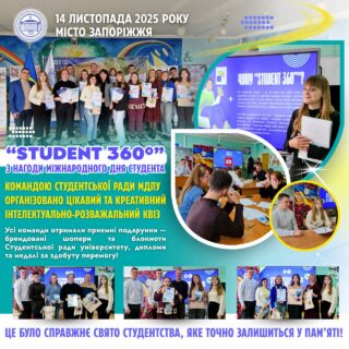🎉 14 листопада команда Студентської ради МДПУ імені Богдана Хмельницького провела інтелектуально-розважальний квіз “STUDENT 360°” у місті Запоріжжя, присвячений Міжнародному дню студентів.