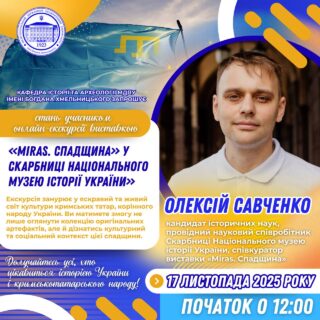 👨🏼🎓✅ Лектор: Олексій Савченко – кандидат історичних наук, провідний науковий співробітник Скарбниці Національного музею історії України, співкуратор виставки «Miras. Спадщина».