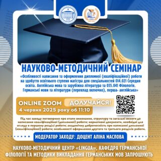 📖‼️Науково-методичний центр «Lingua», кафедра германської філології та методики викладання германських мов запрошують магістрантів прийняти участь у науково-методичному семінарі «Особливості написання та оформлення дипломної (кваліфікаційної) роботи на здобуття освітнього ступеня магістра для спеціальностей 014.021 Середня освіта. Англійська мова та зарубіжна література та 035.041 Філологія. Германські мови та літератури (переклад включно), перша- англійська».