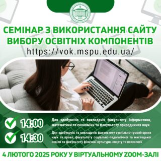 👩🏻💻💫Для того щоб зробити цей процес зручним і зрозумілим, Центр ІТ та цифрової трансформації Мелітопольського державного педагогічного університету імені Богдана Хмельницького запрошує на онлайн-семінар з використання сайту вибору освітніх компонентів https://vok.mspu.edu.ua/.