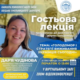 👩🏻🎓🇺🇦 Запрошений лектор: Чудінова Дар’я Іванівна – експертка з тем національної пам’яті, гідеса, здобувачка II (магістерського) рівня ОНП Гарденотерапія.