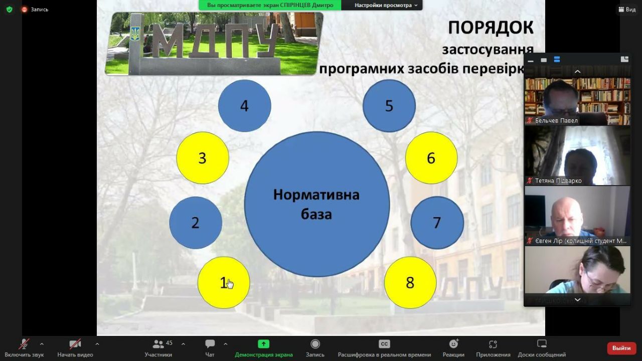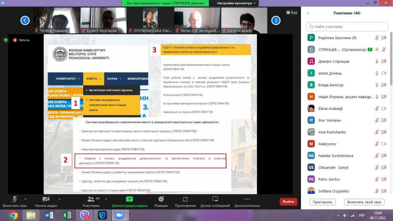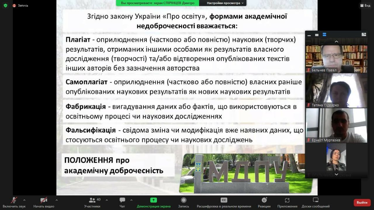 Під час спілкування представлено основні внутрішні нормативні документи, що регламентують питання академічної доброчесності та запобігання плагіату в освітній діяльності університету, розглянуто порядок застосування програмних засобів перевірки з метою запобігання та протидії проявам академічної недоброчесності в МДПУ.