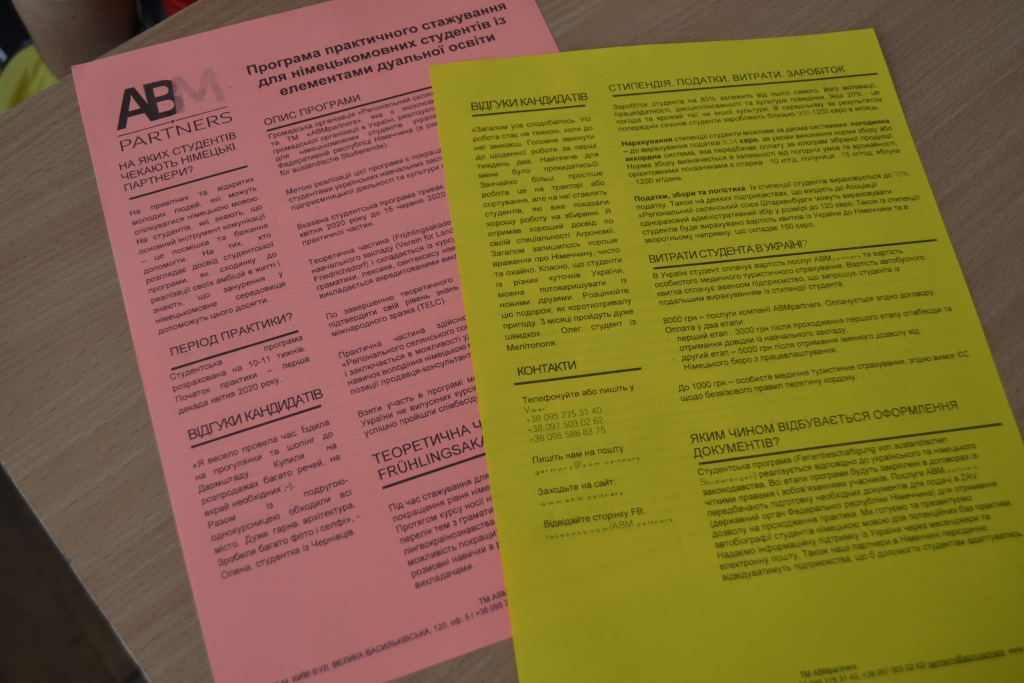 Представники компанії Віталій Андрусяк та Сергій Білоконь презентували програму академічної мобільності та мовної практики у Німеччині. Вона розрахована для студентів переважно з високим рівнем володіння німецької мови. Для учасників, які бажають покращити рівень німецької, передбачений курс (Sommerakademie – Deutschkurs) у Hessische Landvolk-Hochschule Verein für Landvolkbildung e.V., який складатиме не менше 40 академічних годин, по завершенню надаватиметься сертифікат міжнародного зразка затверджений Міністерством освіти Федеральної землі Гессен.