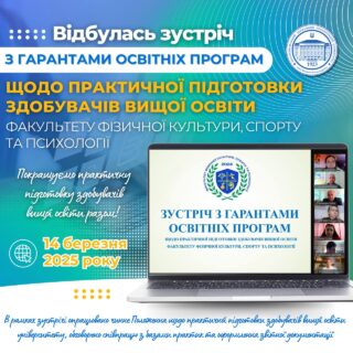🎓💡14 березня 2025 року на факультеті фізичної культури, спорту та психології відбулася зустріч заступника декана з організаційно-виховної роботи, питань практик та працевлаштування з гарантами освітніх програм, присвячена питанням практичної підготовки здобувачів вищої освіти.