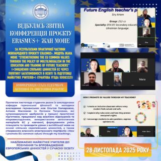 📚💭Протягом листопада студенти разом із викладачами кафедри германської філології та методики викладання германських мов Ольгою Гончаровою, Аліною Масловою та Євгеном Топаловим, які супроводжували здобувачів у процесі практичної підготовки, працювали над аналізом відеоуроків та мікровикладанням, використанням автентичних матеріалів ЄС у навчанні, формуванням умінь планувати та проводити уроки з англійської мови на основі спільних європейських цінностей, а також створенням власного електронного портфоліо «How I promote EU common values through my teaching».